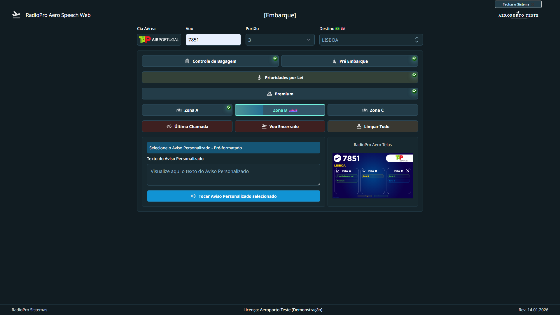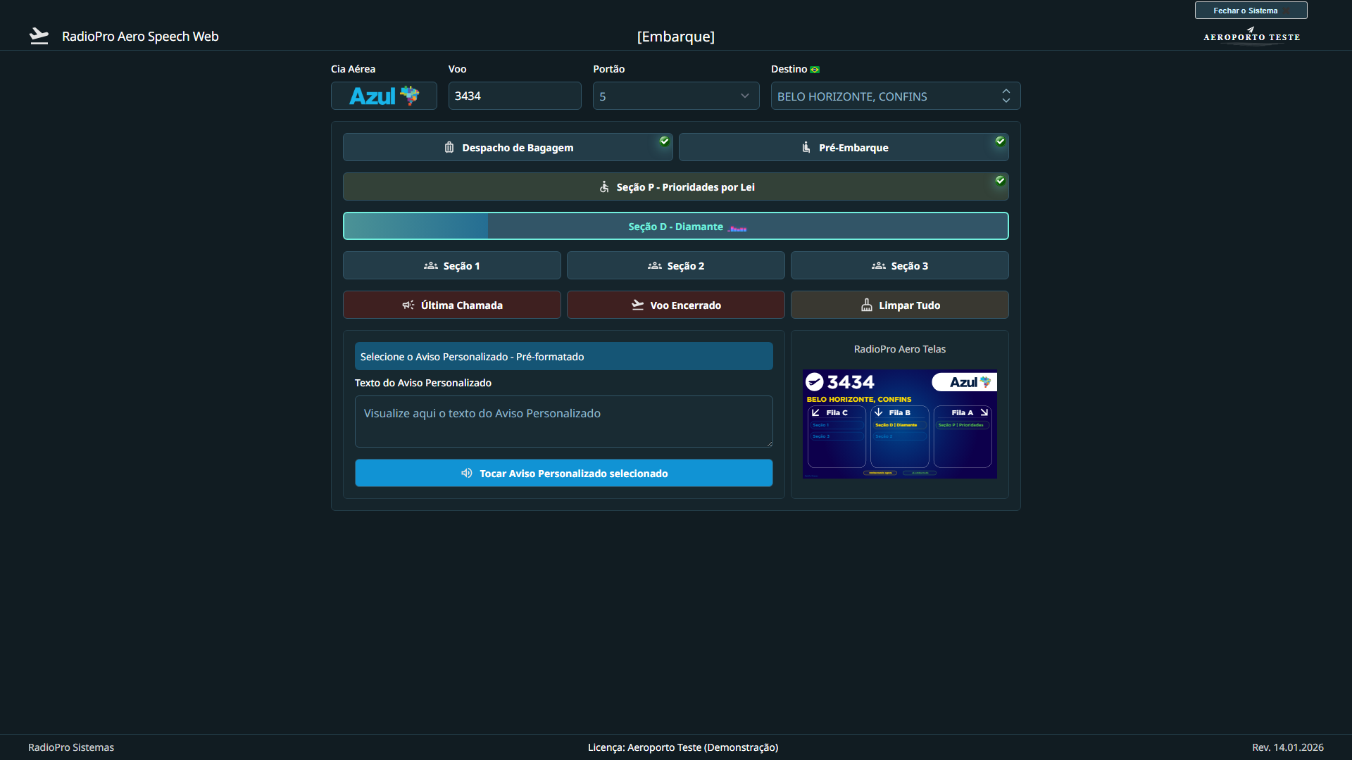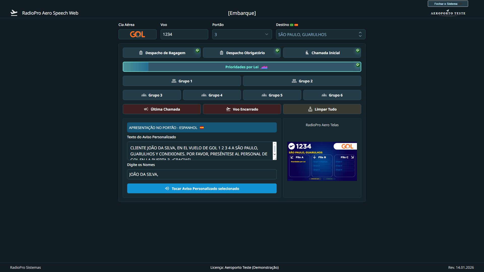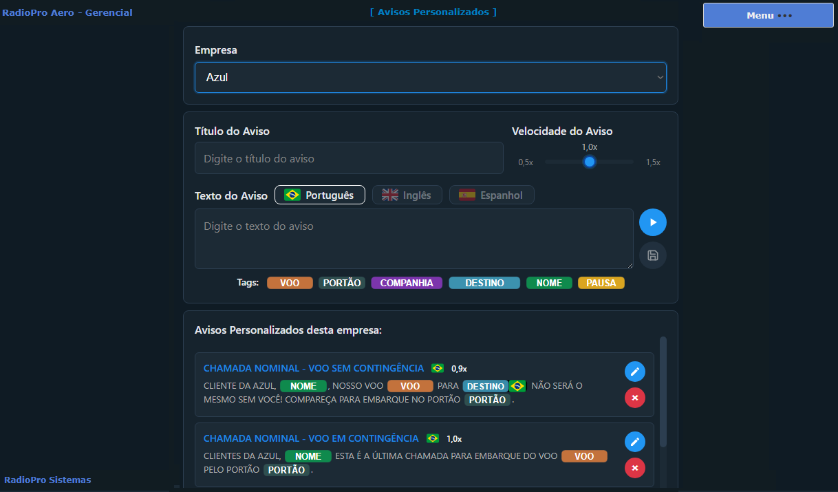 O sistema RadioPro Aero Speech é um software responsável por disparar os áudios para avisos de embarque e desembarque de passageiros aéreos, possibilitando aviso sonoro suave e de fácil entendimento aos usuários, fazendo com que o áudio seja agradável e de fácil entendimento.